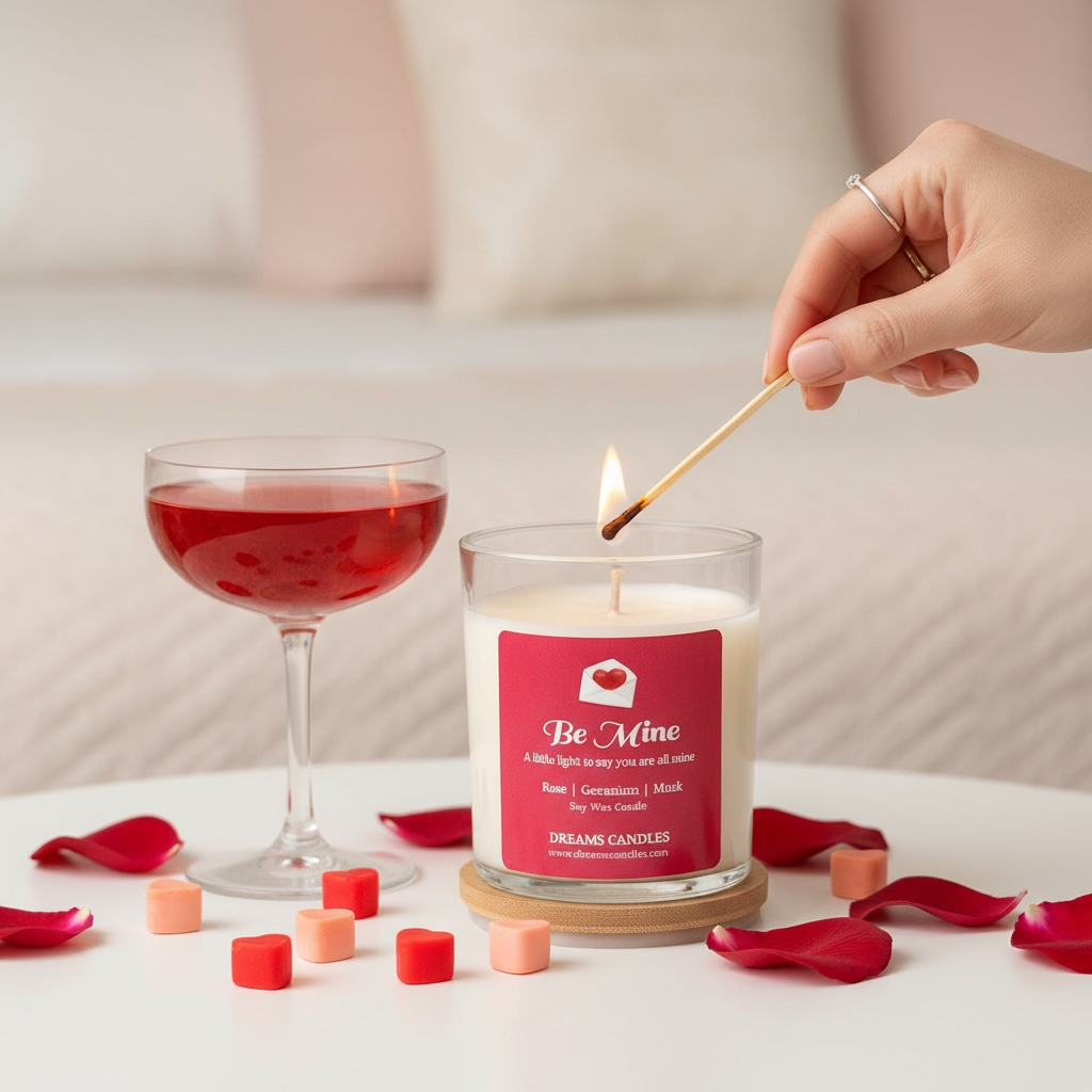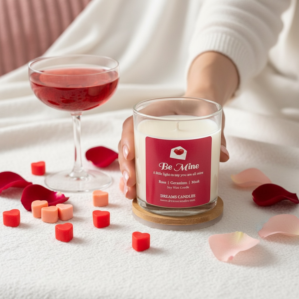 Be Mine candle captures the tender magic of new love—soft, hopeful, and quietly intoxicating. It opens with the delicate bloom of Rose, wrapped in the gentle, floral embrace of Geranium, while subtle Green notes sparkle like the first flutter of hearts meeting. As the candle burns, warm, velvety Musk unfurls, leaving a skin-like, lingering caress that fills the space with quiet intimacy. Effortless yet deeply romantic, this fragrance whispers of connection, closeness, and the soft thrill of being wanted.
